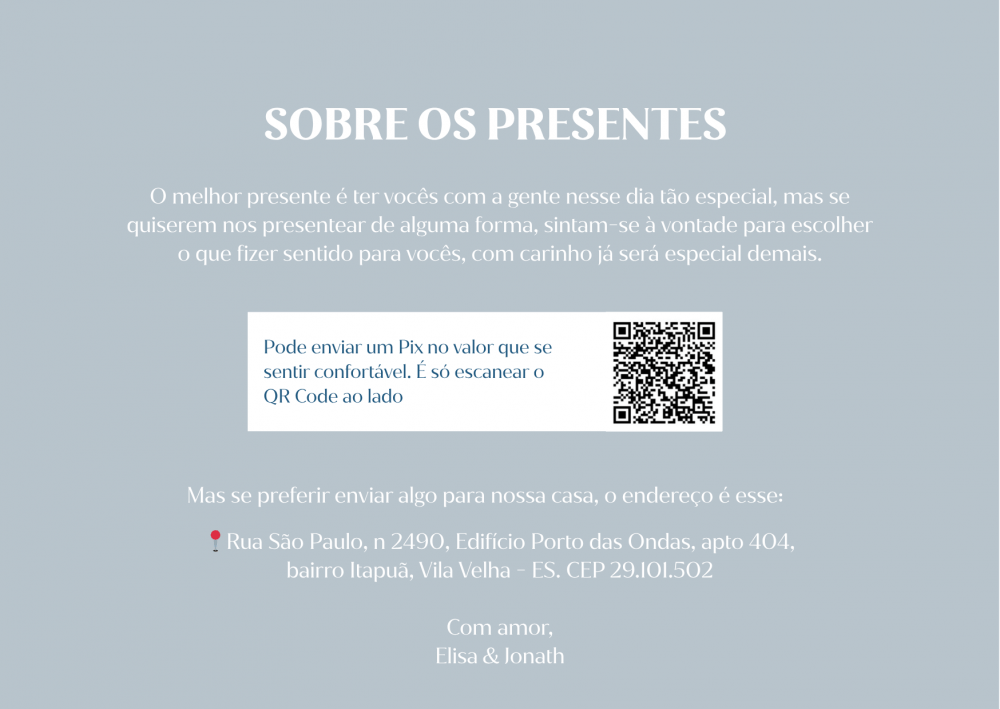 Queremos muito viver esse momento com vocês. Nossa celebração será rápida, mas cheia de significado , e acontecerá pontualmente, às 15h00 no dia 02 de Maio de 2026. Esperamos por vocês para celebrar o amor, a fé e o começo de uma nova etapa, com o coração em festa.